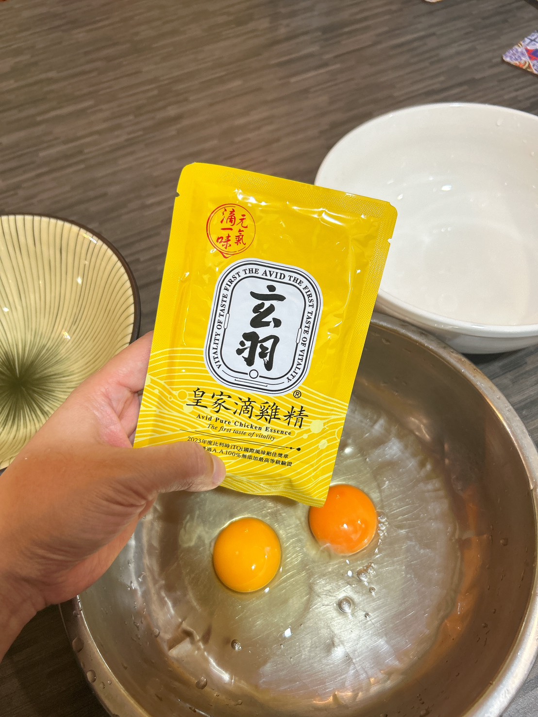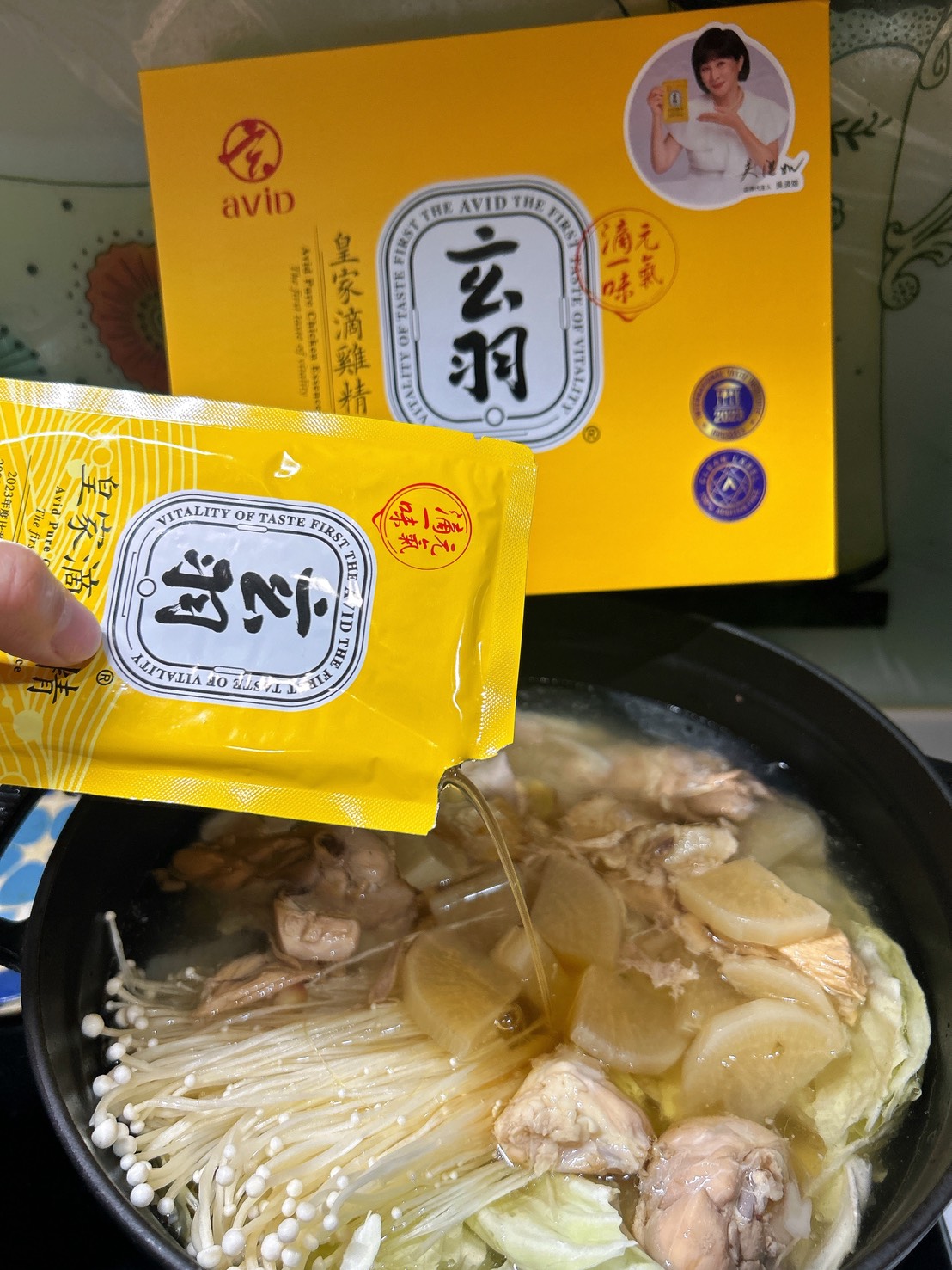 有點六分熟就可以加點滴雞精啦!再稍微煮一下,加入水至八分滿,第二包滴雞精豪邁地加入(接業配的好處就是可以豪氣的用😆)
