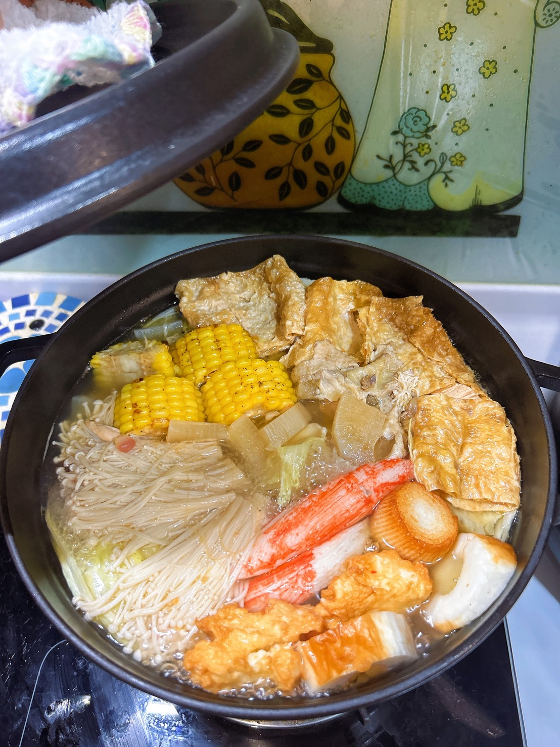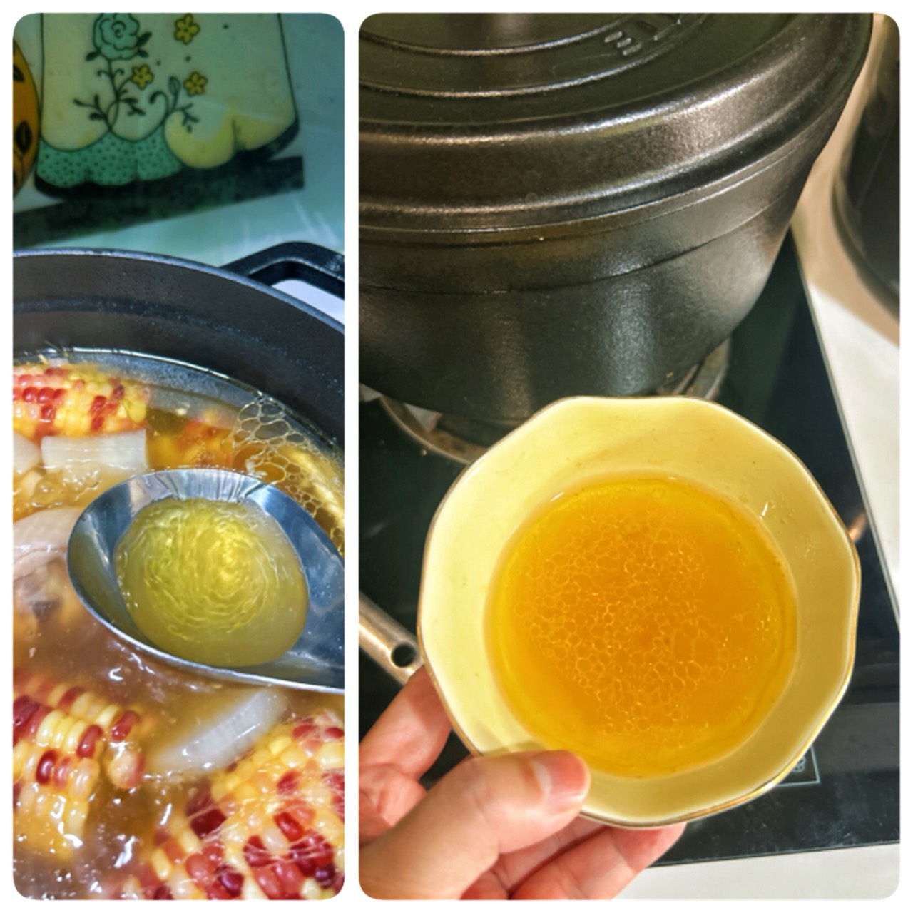 水滾後轉小火再煮十分鐘,開蓋撈起一些表面油脂至碗裡,勤儉持家巧主婦我會把這些雞油冰冷凍,下次炒青菜可是會讓你的菜又香又美呢!