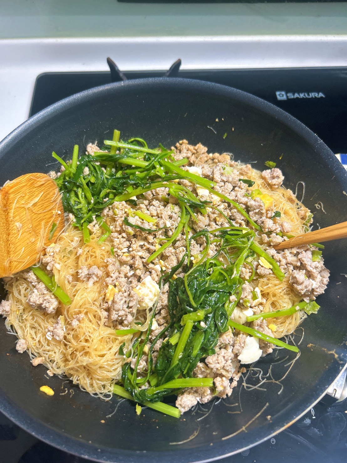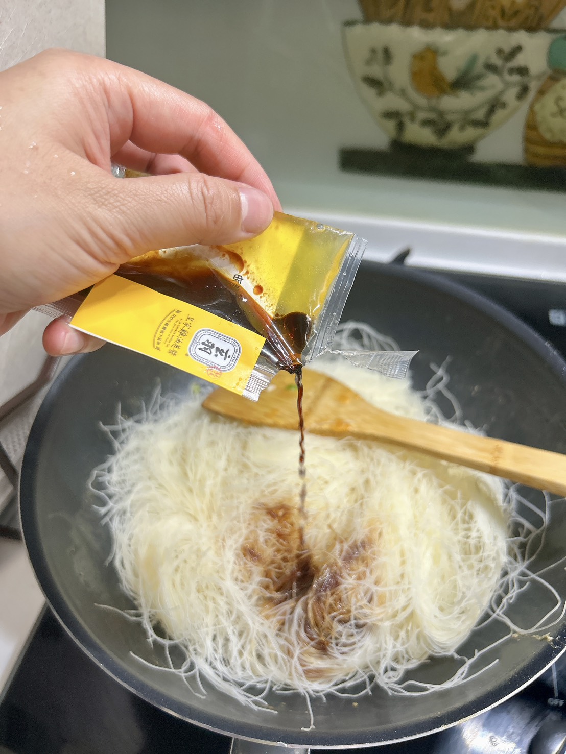 然後撈起料,湯汁千萬不要撈起來,接下來就是放米粉炒啊炒,覺得太乾我還是會加點日式醬油拌色炒濕潤一點