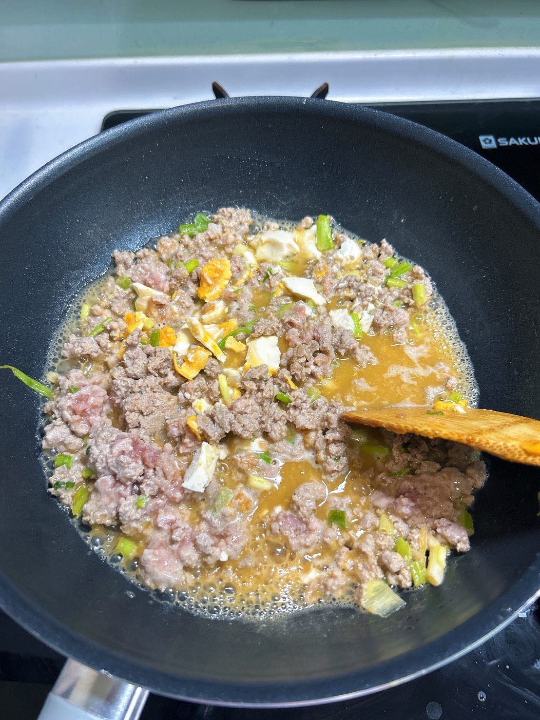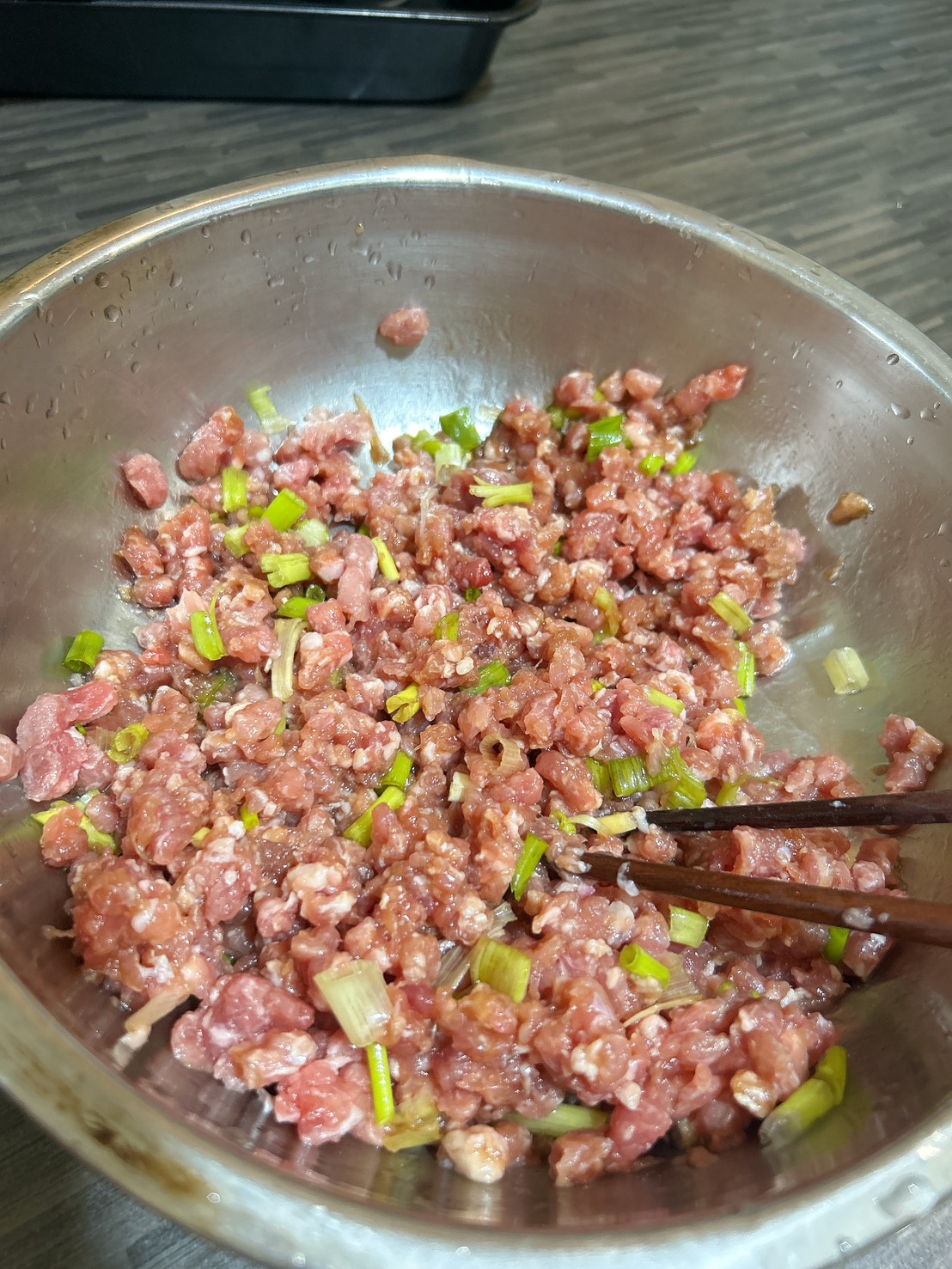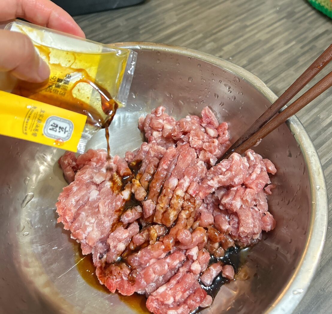 這道看似複雜其實很簡單。雞油蔥先醃一下豬絞肉,然後就下鍋炒啦!
