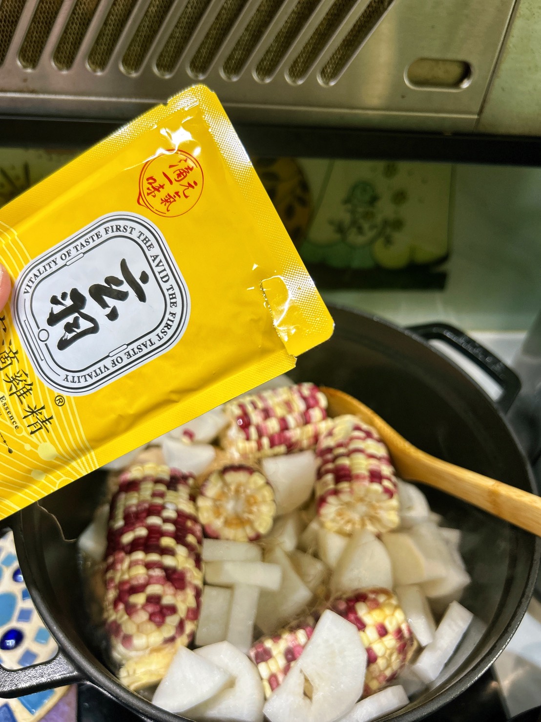 回到正題,用滴雞精燉湯真的是如魚得水,湯味更濃,鹹度記得試試,吃很清淡的朋友也許只要再加一點點鹽巴就好,湯裡有甜甜的玉米,還有窮人的人蔘-白蘿蔔,這道燉湯絕對是換季食補最經濟又營養的料理!