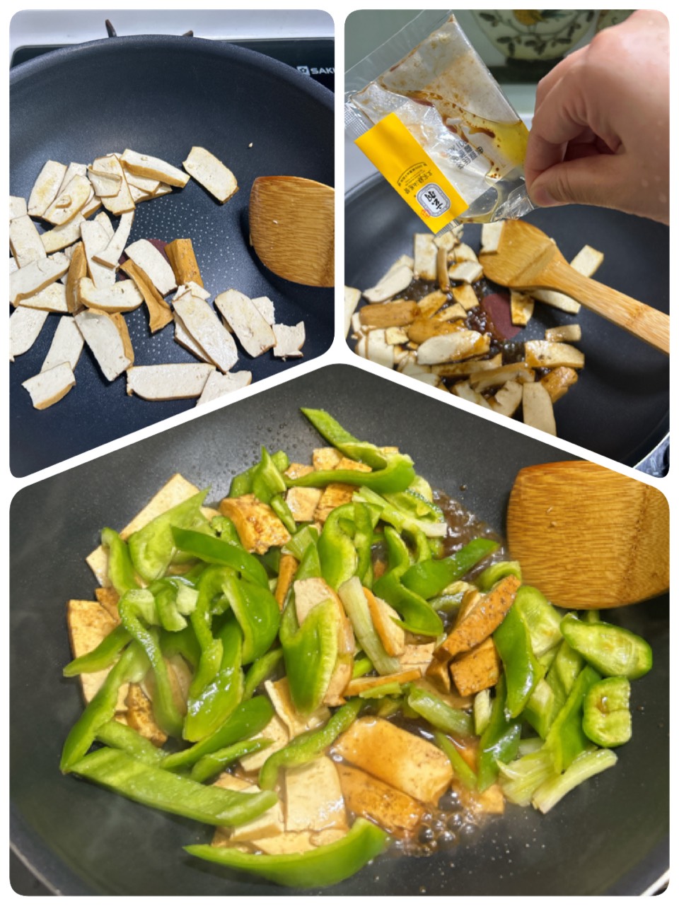 同場加映古早味的青椒炒豆乾芋粿巧,豆乾先煸香乾炒(其實芋粿也可以先煎的有點洽洽再盛盤),再加入雞油蔥、青椒、芋粿巧拌炒一下,加點鹽巴炒一炒就可以香噴噴上桌啦!這道料理長輩們都超喜歡。