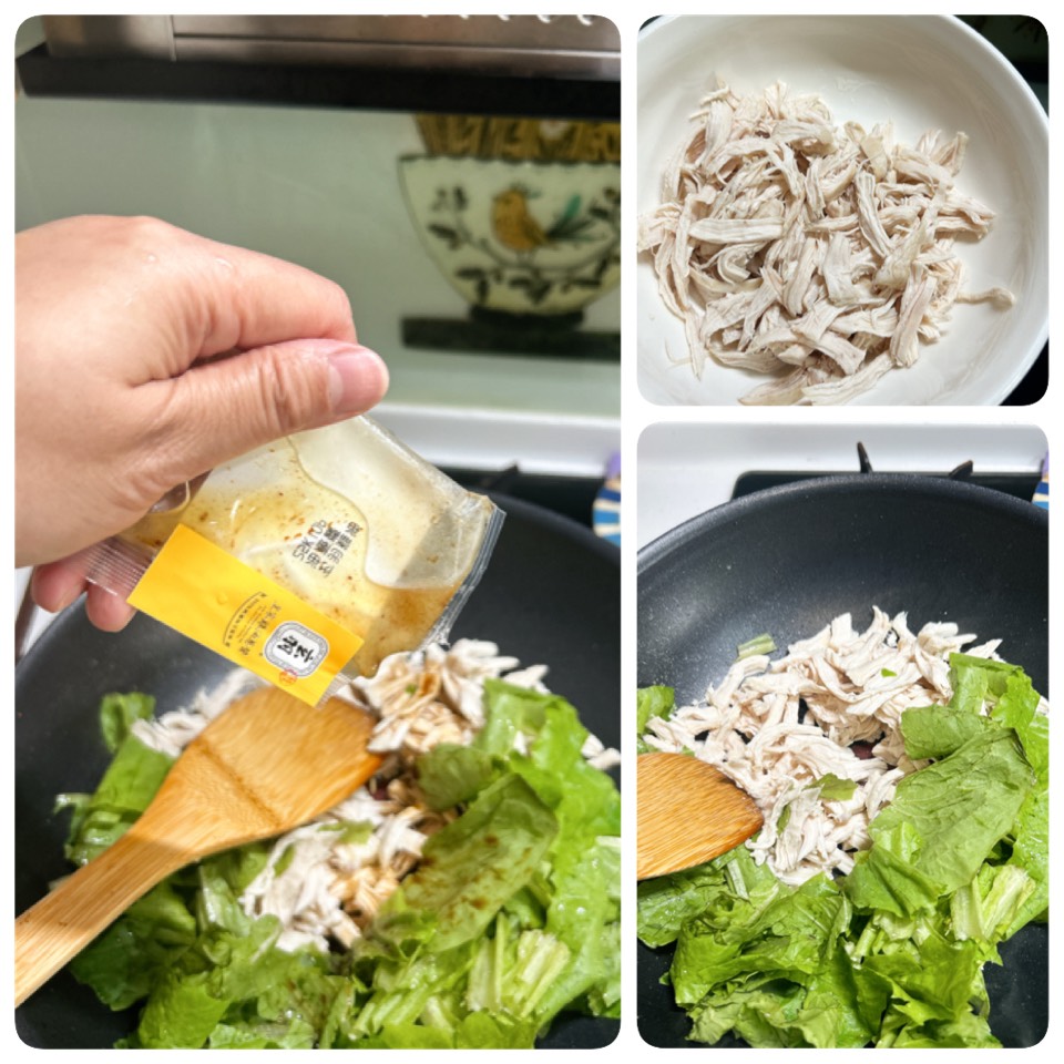 這道也是很古早口味滴~先把雞胸肉蒸熟後拔絲(雞胸肉我可是加了一些鹽巴泡水冰鎮一小時後才蒸熟,這步驟讓雞胸不柴又鎖住鮮甜),然後雞絲和青菜拌炒,再加入主婦神物雞油蔥拌炒,