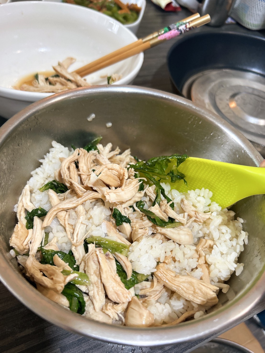 最後再把炒好的雞絲青菜拌入,香噴噴的古早味麻油雞油蔥肉飯完成了,是不是很簡單啊!這道雞油雞絲飯不論是夏天或冬天吃都很適合,家裡的小孩不愛吃飯也會喜歡這道香噴噴的雞絲飯唷~