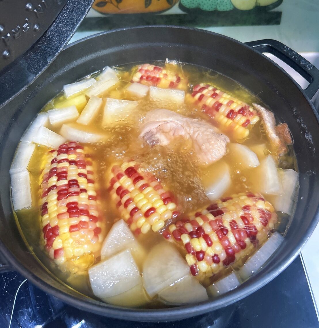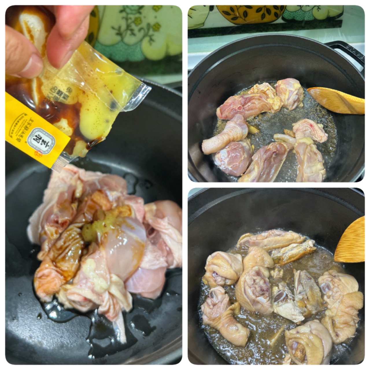 除了滴雞精自己溫熱喝外。老公常常加班回到家又熬夜追劇,有時候我也會準備滴雞精給老公喝。家裡兩位小人偶爾來場感冒,做媽媽的還是得好好照顧這些家人,來熬個玉米蘿蔔雞湯吧!我這次用鑄鐵鍋燉煮,先用雞油蔥炒香老薑和雞腿肉