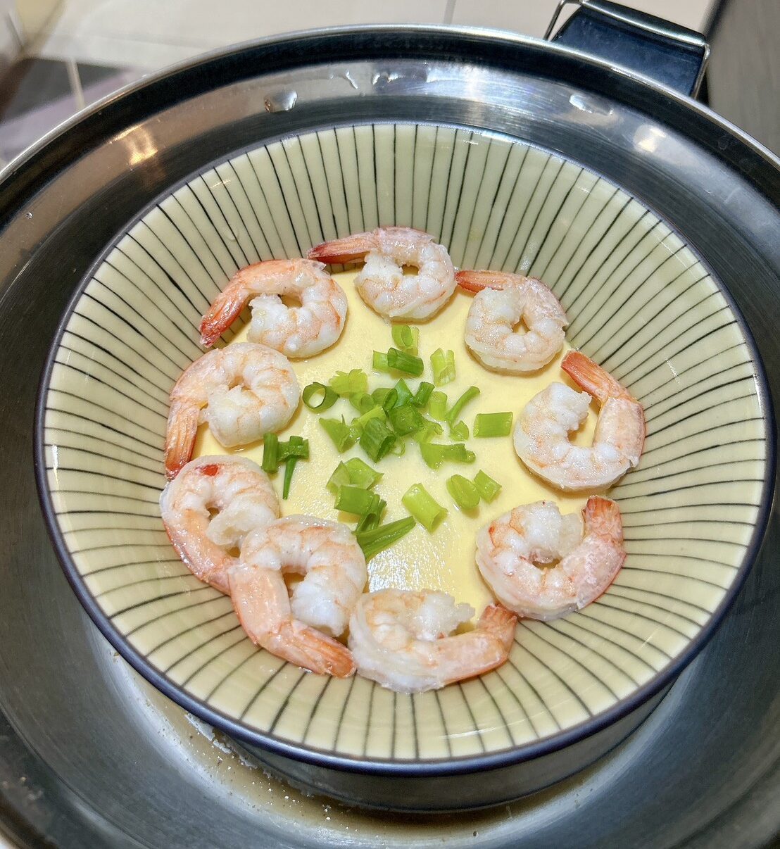 (滴雞精和蛋的比例為一顆蛋配4瓢半個蛋殼,所以兩顆蛋我得配8瓢半個蛋殼)一包滴雞精不夠,就補高湯或日式醬油,接著放入電鍋蒸,蒸蛋蓋上鍋蓋留一點小縫,一杯水去蒸跳起來再排上稍早煎好的蝦仁和蔥花再保溫一下就完成了